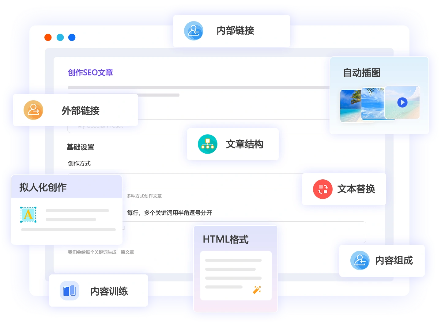 产品拥有各种面向SEO的创作规则,包括HTML规则、内外链设置、插图设置、行动号召、常见问题设置等